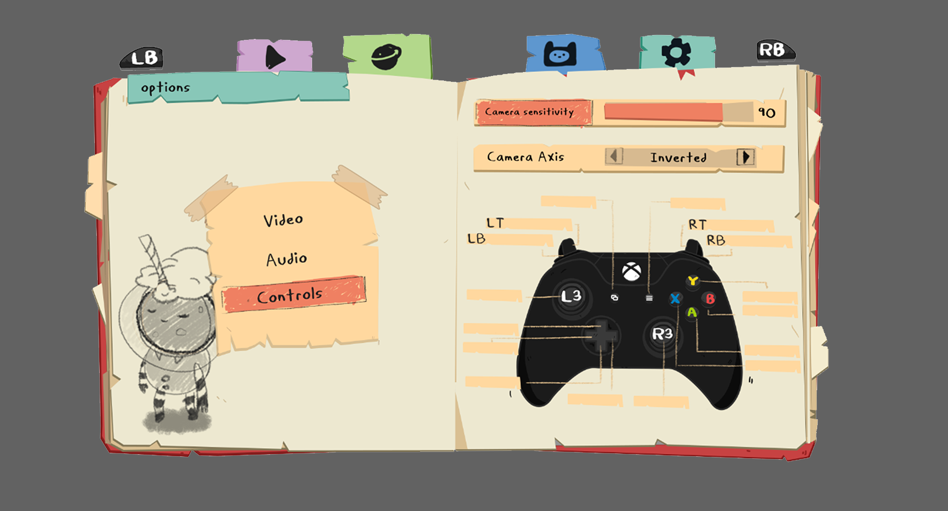 (Pause) Menu: Finn's Notebook Party Page, Graphics Settings, Control Settings